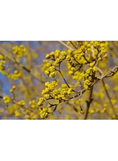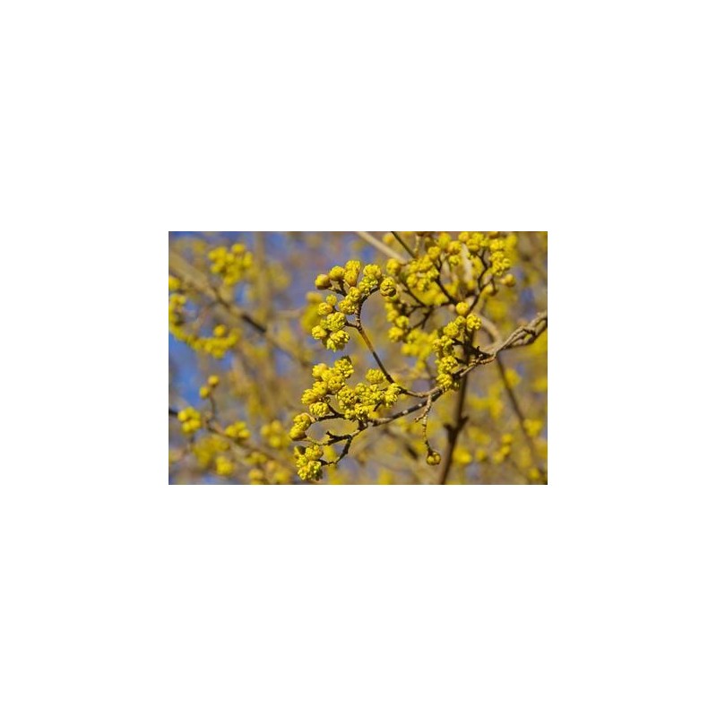 5 m, floraison jaune d\'or sur bois nu en février -mars, feuille verte, jaune or en automne, fruits rouges, comestibles, tous sols, massif.