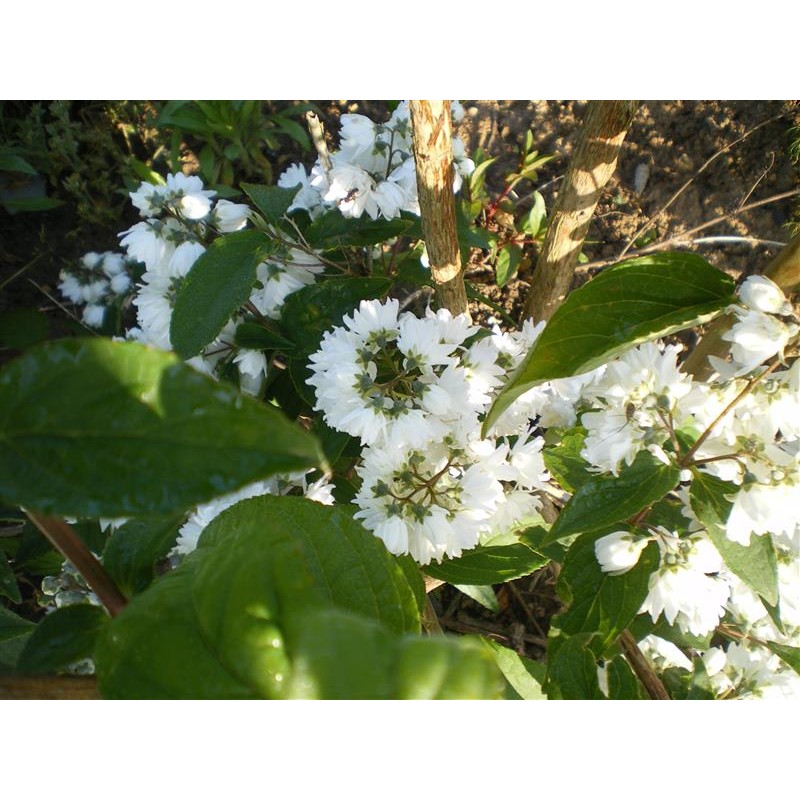 2.50 m, port érigé, fleur en panicule blanche, double, étoilé en juin, expo soleil mi-ombre, sol ordinaire pas trop sec, haie, massif.