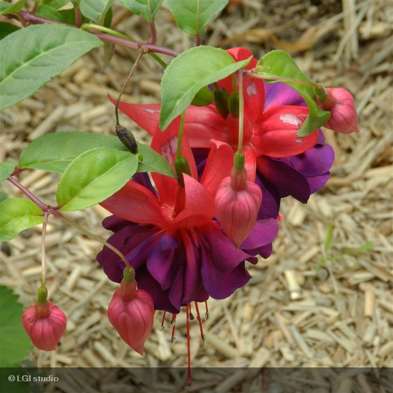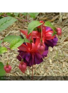 0,80 m, rustique, port érigé, fleur en grosse clochette rouge, intérieur violet, feuillage vert.