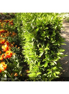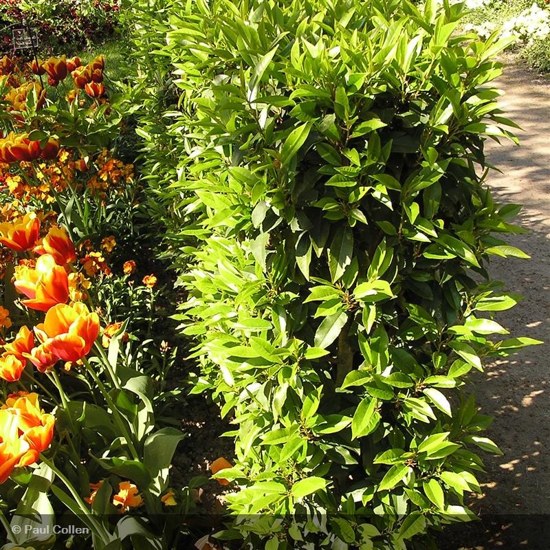 2 m, feuille étroite, vert foncé, port pyramidal, fleur blanche en grappe, parfumée en 5-6, sol même calcaire, bien drainé, bac, massif.